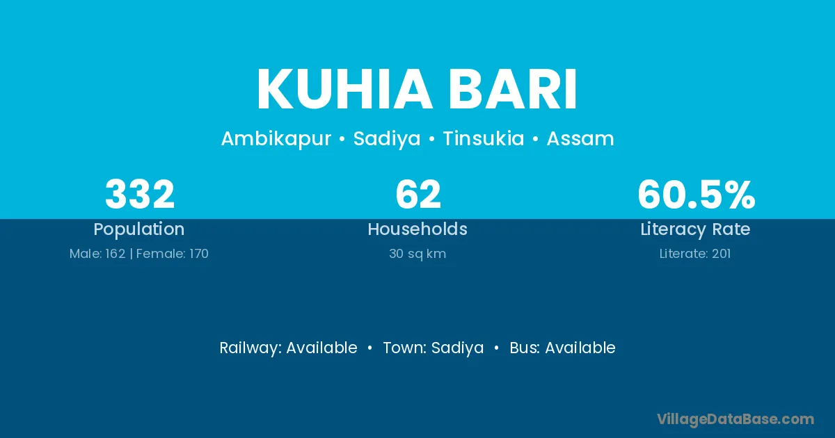 Kuhia Bari village has a total population of 332 people, of which 162 are males and 170 are females.