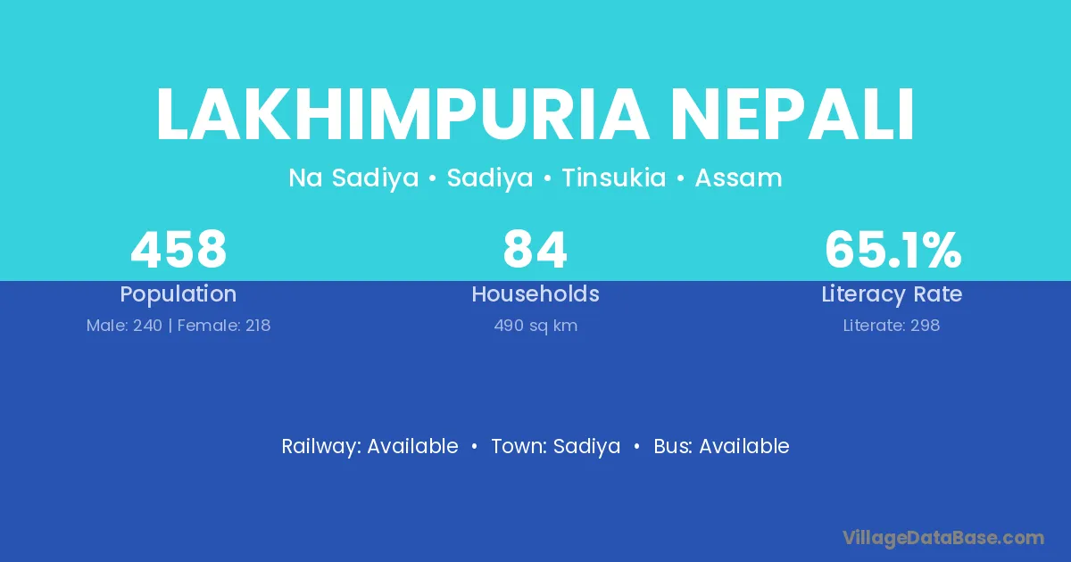 Lakhimpuria Nepali village has a total population of 458 people, of which 240 are males and 218 are females.
