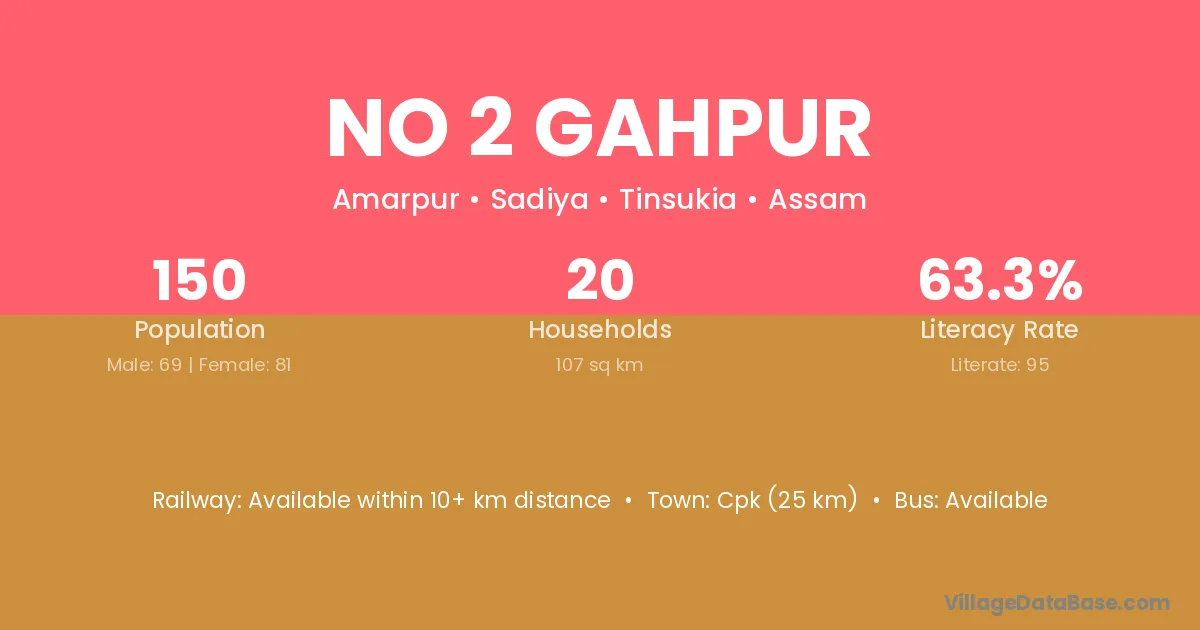 No 2 Gahpur village has a total population of 150 people, of which 69 are males and 81 are females.