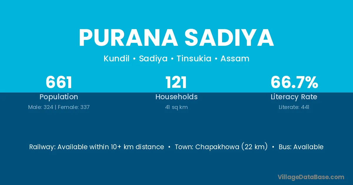 Purana Sadiya village has a total population of 661 people, of which 324 are males and 337 are females.