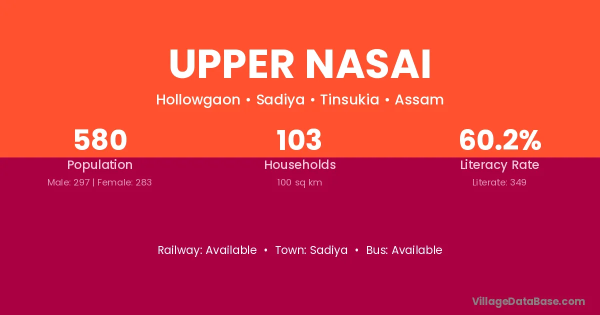 Upper Nasai village has a total population of 580 people, of which 297 are males and 283 are females.