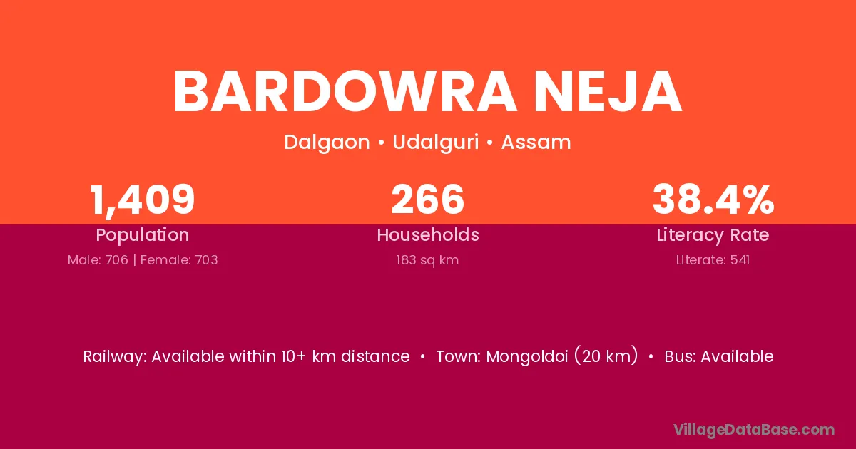 Bardowra Neja village has a total population of 1,409 people, of which 706 are males and 703 are females.