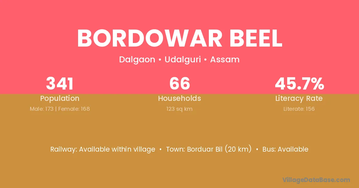 Bordowar Beel village has a total population of 341 people, of which 173 are males and 168 are females.