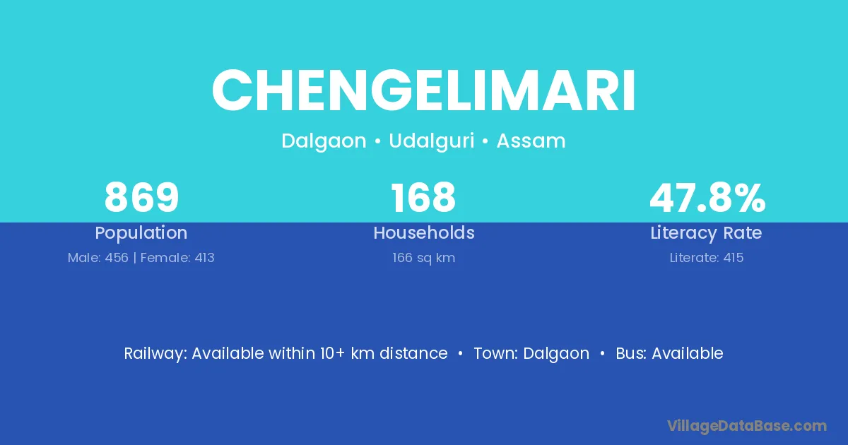 Chengelimari village has a total population of 869 people, of which 456 are males and 413 are females.