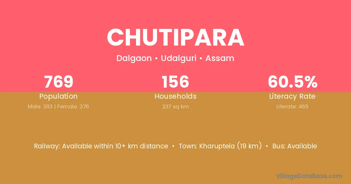 Kharupteia (19 km) is the nearest town to Chutipara village for major economic activities and is located approximately 19 km away.