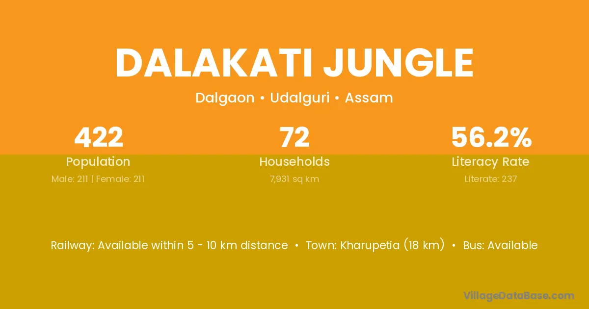 Dalakati Jungle village has a total population of 422 people, of which 211 are males and 211 are females.