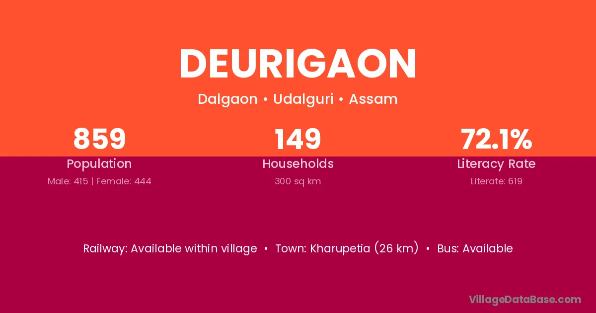 Deurigaon village has a total population of 859 people, of which 415 are males and 444 are females.