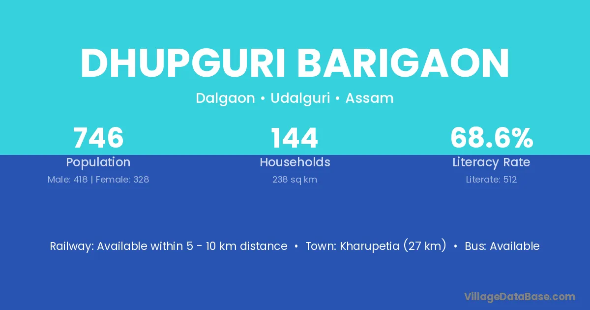 Kharupetia (27 km) is the nearest town to Dhupguri Barigaon village for major economic activities and is located approximately 27 km away.