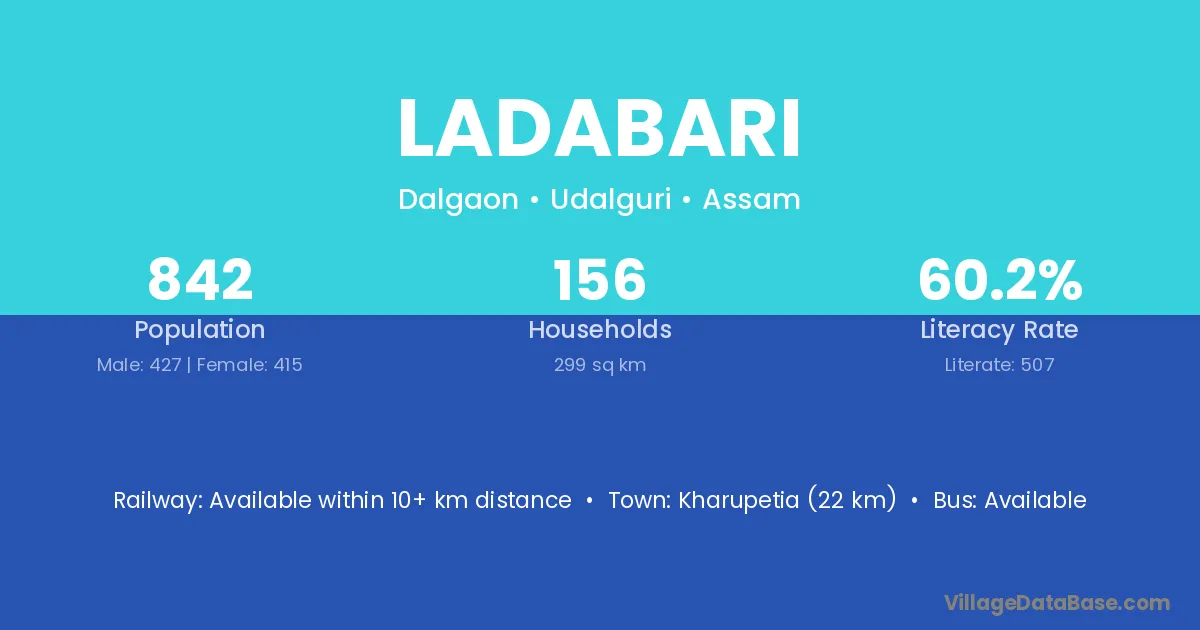 Kharupetia (22 km) is the nearest town to Ladabari village for major economic activities and is located approximately 22 km away.
