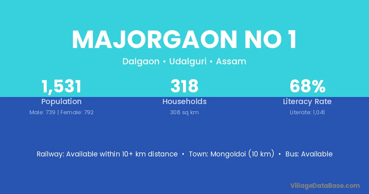 Mongoldoi (10 km) is the nearest town to Majorgaon No 1 village for major economic activities and is located approximately 10 km away.