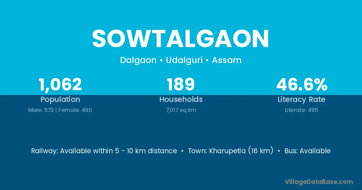 Kharupetia (16 km) is the nearest town to Sowtalgaon village for major economic activities and is located approximately 16 km away.