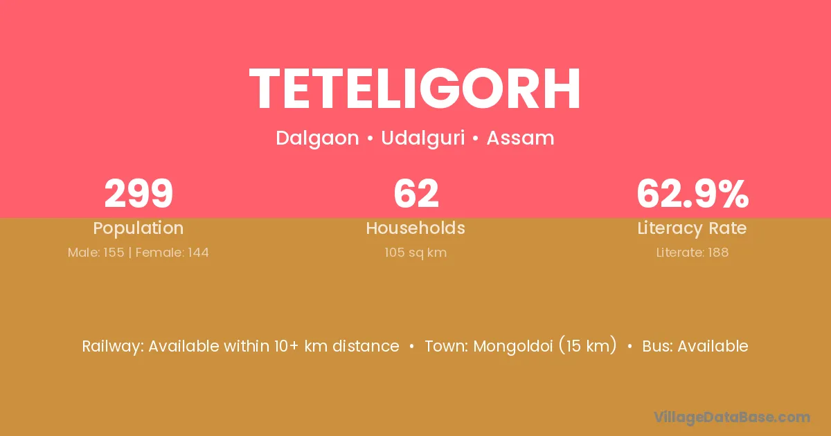 Mongoldoi (15 km) is the nearest town to Teteligorh village for major economic activities and is located approximately 15 km away.