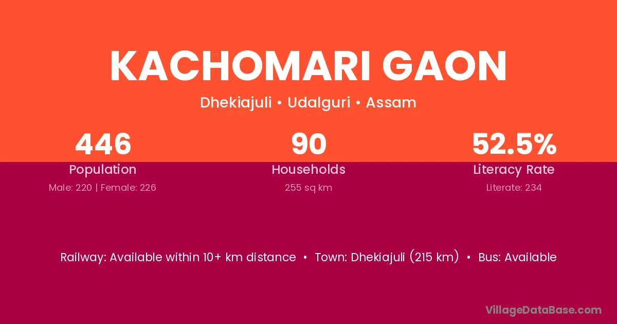 Kachomari Gaon village has a total population of 446 people, of which 220 are males and 226 are females.