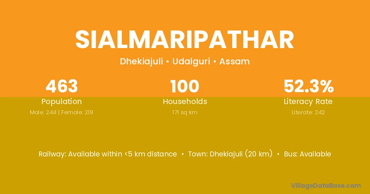 Dhekiajuli (20 km) is the nearest town to Sialmaripathar village for major economic activities and is located approximately 20 km away.