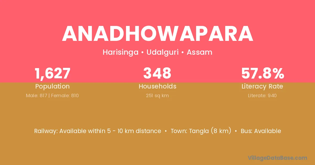 Tangla (8 km) is the nearest town to Anadhowapara village for major economic activities and is located approximately 8 km away.