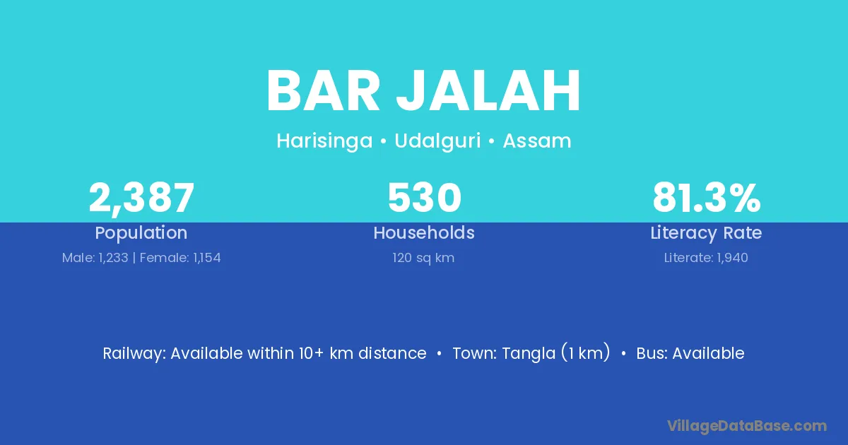 Bar Jalah village has a total population of 2,387 people, of which 1,233 are males and 1,154 are females.