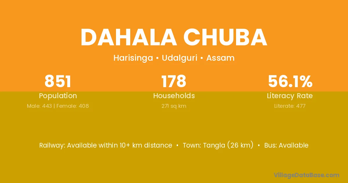 Dahala Chuba village has a total population of 851 people, of which 443 are males and 408 are females.