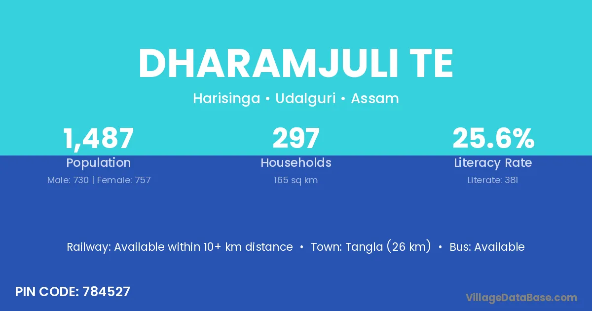 Dharamjuli Te village has a total population of 1,487 people, of which 730 are males and 757 are females.