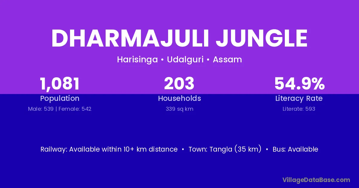 Dharmajuli Jungle village has a total population of 1,081 people, of which 539 are males and 542 are females.