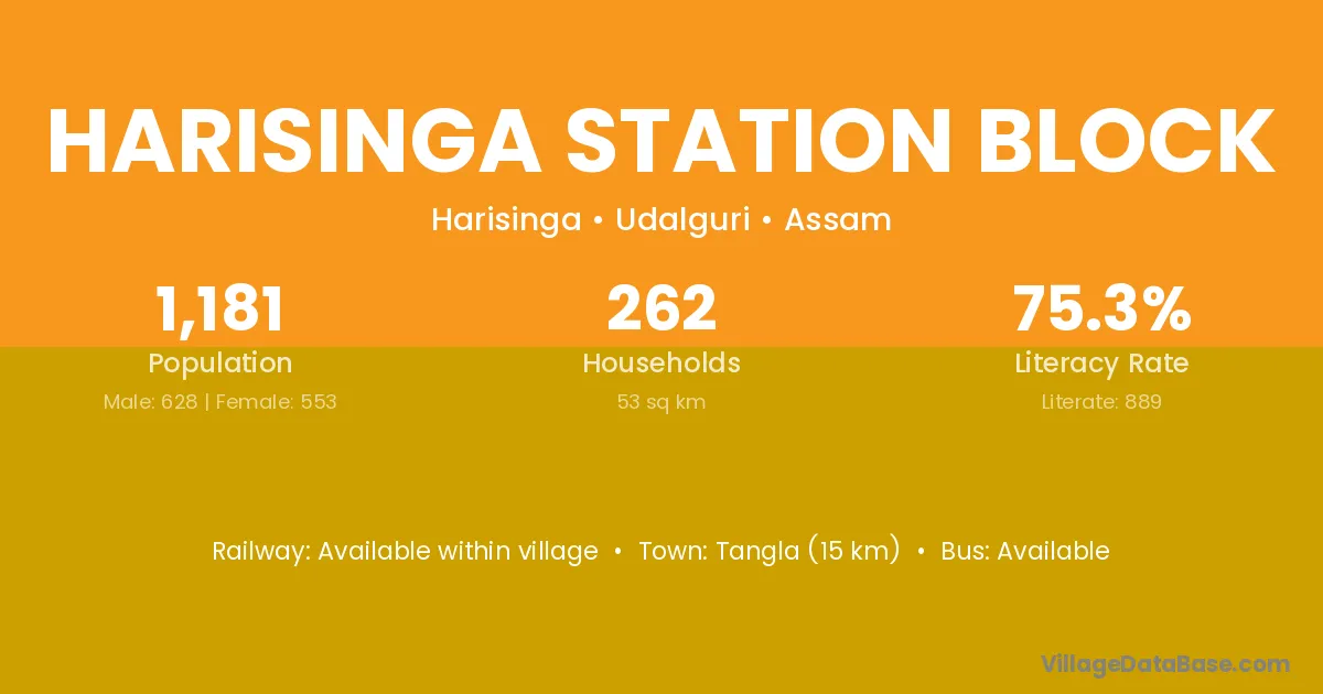 Harisinga Station Block village has a total population of 1,181 people, of which 628 are males and 553 are females.