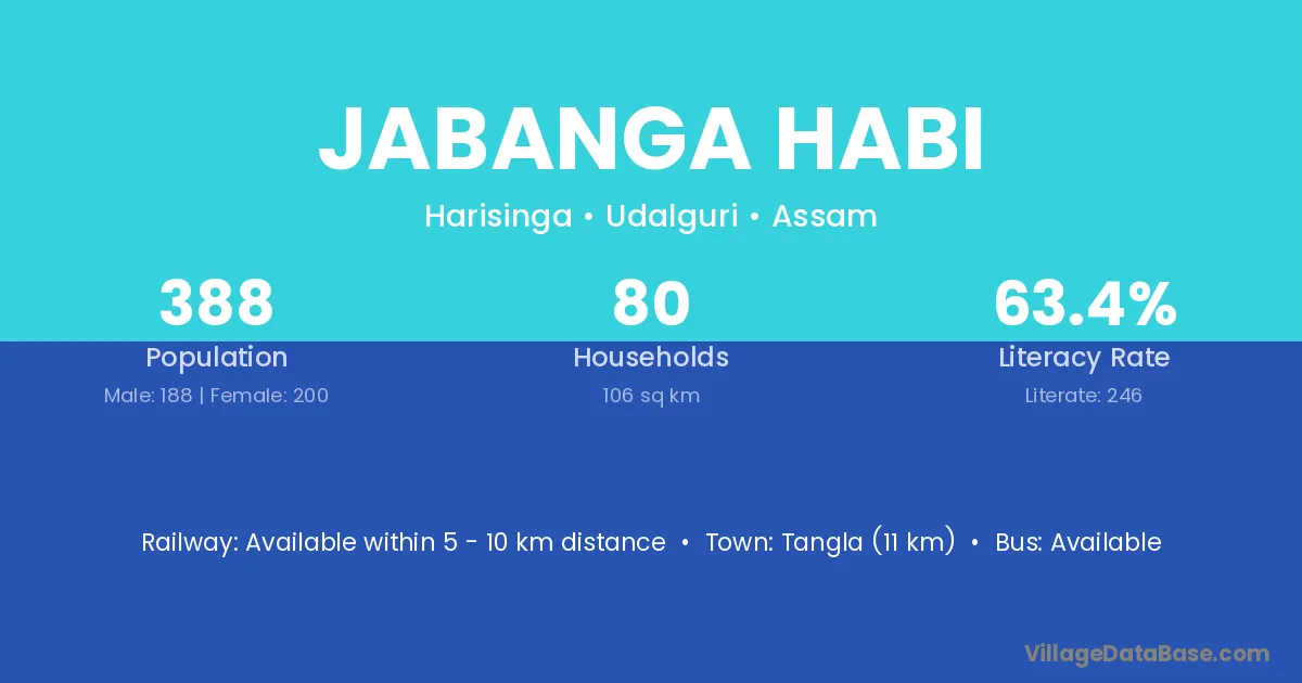 Tangla (11 km) is the nearest town to Jabanga Habi village for major economic activities and is located approximately 11 km away.
