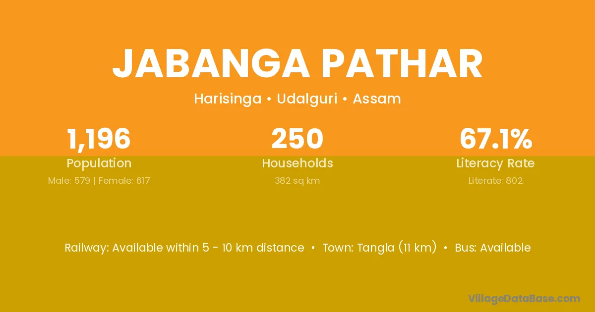 Tangla (11 km) is the nearest town to Jabanga Pathar village for major economic activities and is located approximately 11 km away.