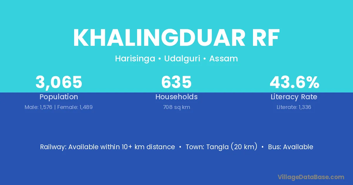 Tangla (20 km) is the nearest town to Khalingduar Rf village for major economic activities and is located approximately 20 km away.