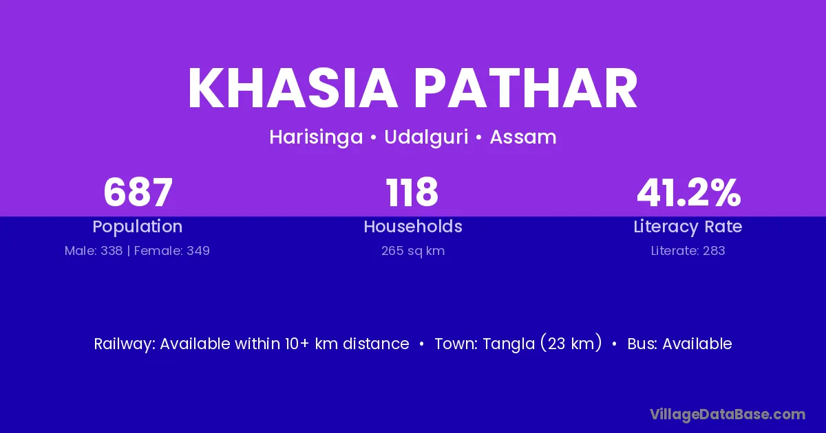 Khasia Pathar village has a total population of 687 people, of which 338 are males and 349 are females.
