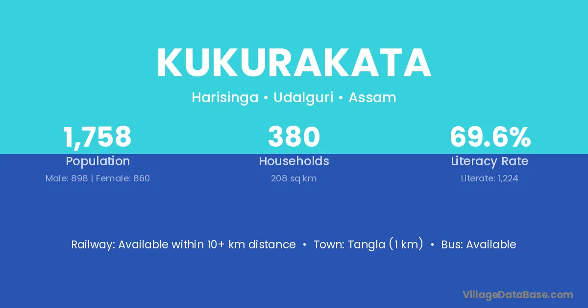 Tangla (1 km) is the nearest town to Kukurakata village for major economic activities and is located approximately 1 km away.