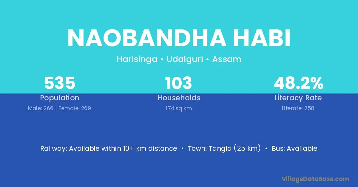 Tangla (25 km) is the nearest town to Naobandha Habi village for major economic activities and is located approximately 25 km away.