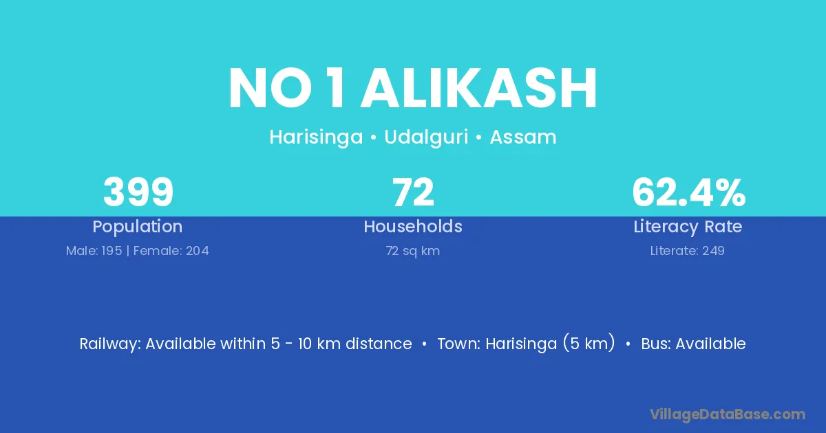 No 1 Alikash village has a total population of 399 people, of which 195 are males and 204 are females.