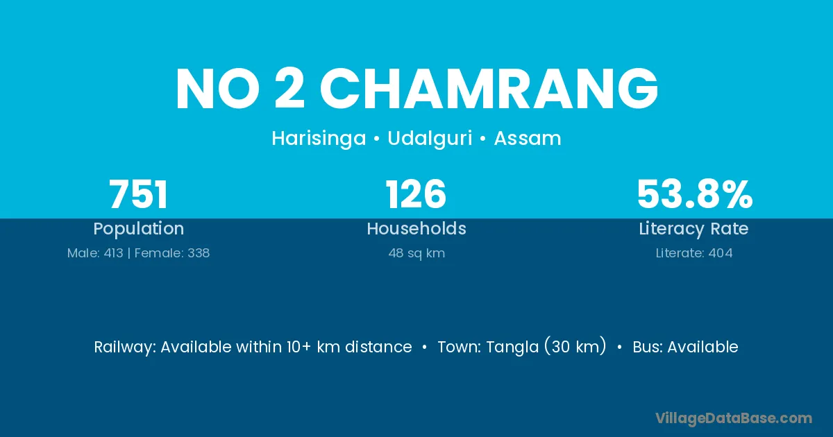 No 2 Chamrang village has a total population of 751 people, of which 413 are males and 338 are females.