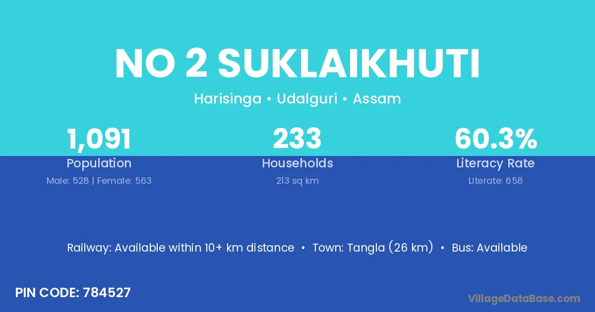 No 2 Suklaikhuti village has a total population of 1,091 people, of which 528 are males and 563 are females.
