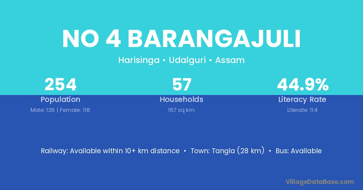 No 4 Barangajuli village has a total population of 254 people, of which 136 are males and 118 are females.