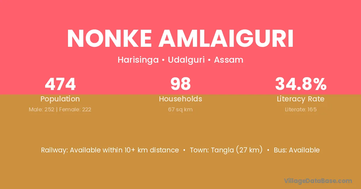 Nonke Amlaiguri village has a total population of 474 people, of which 252 are males and 222 are females.