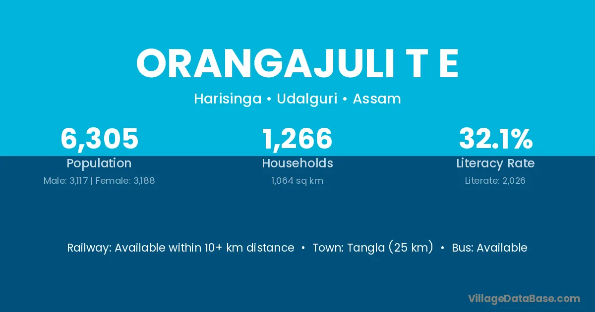Orangajuli T E village has a total population of 6,305 people, of which 3,117 are males and 3,188 are females.