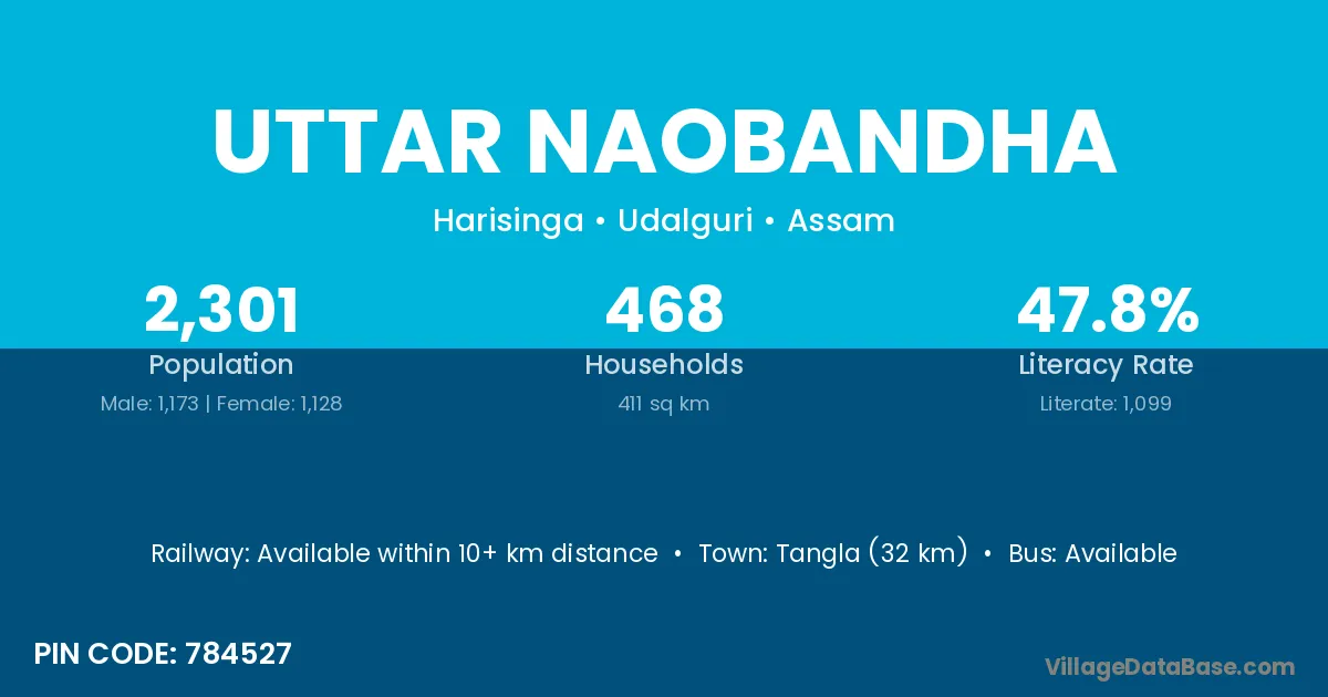 Tangla (32 km) is the nearest town to Uttar Naobandha village for major economic activities and is located approximately 32 km away.