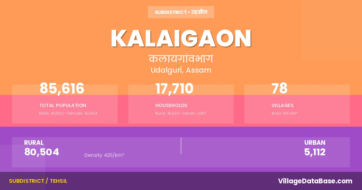 Kalaigaon Subdivision comprises about 78 villages. Below is a list of these villages along with information about their respective gram panchayats and the nearest town: