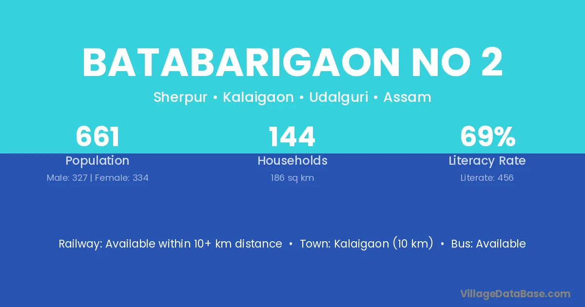 Kalaigaon (10 km) is the nearest town to Batabarigaon No 2 village for major economic activities and is located approximately 10 km away.