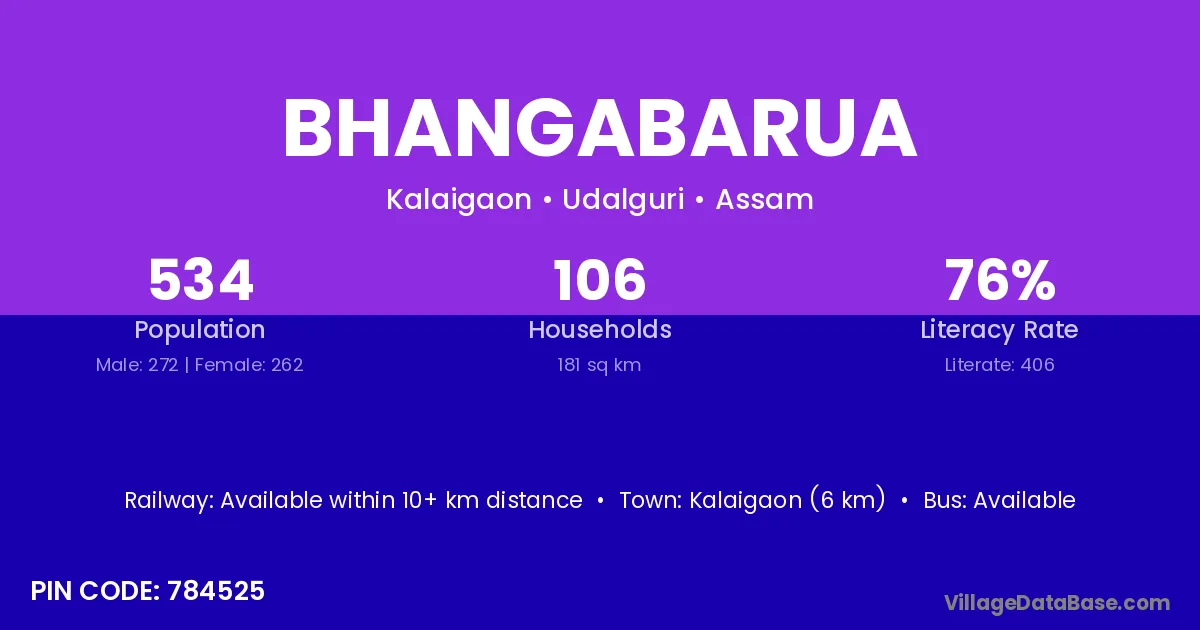 Kalaigaon (6 km) is the nearest town to Bhangabarua village for major economic activities and is located approximately 6 km away.