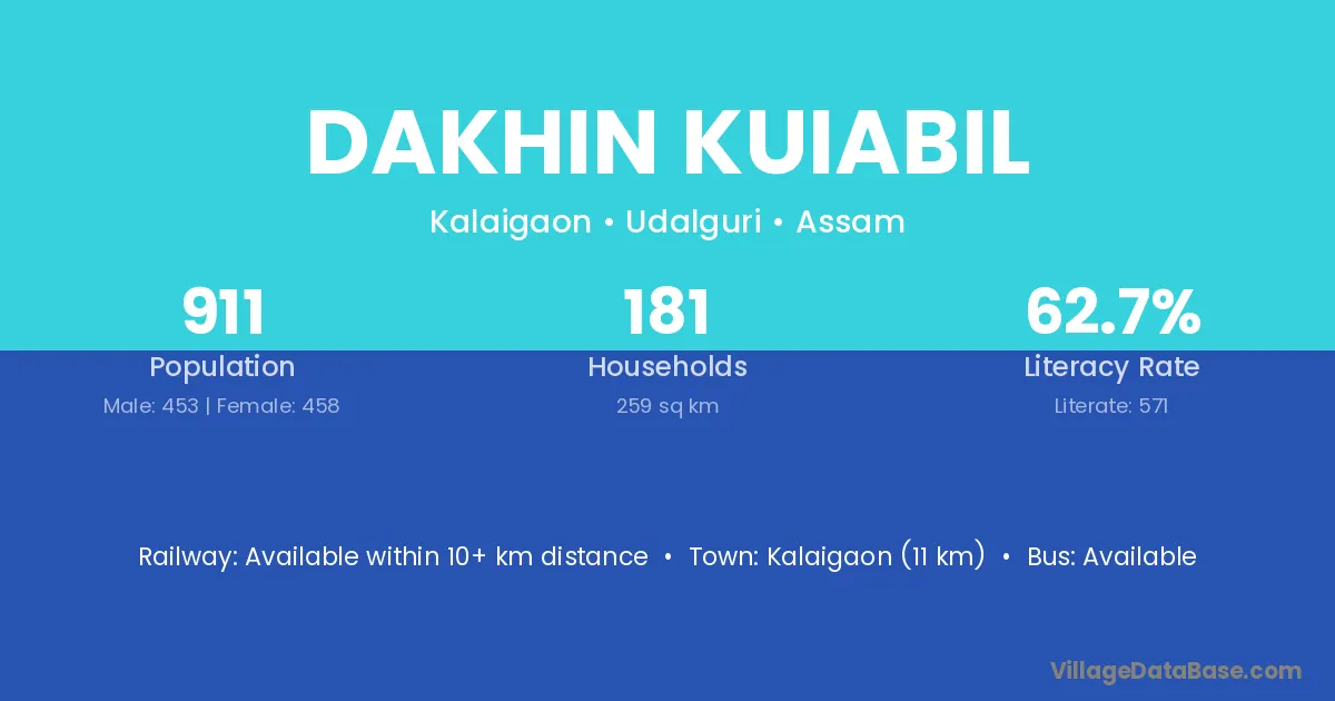 Kalaigaon (11 km) is the nearest town to Dakhin Kuiabil village for major economic activities and is located approximately 11 km away.