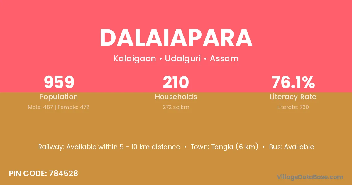 Dalaiapara village has a total population of 959 people, of which 487 are males and 472 are females.