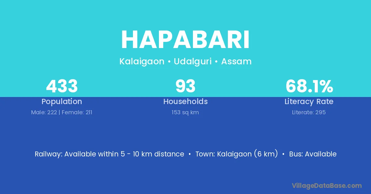 Kalaigaon (6 km) is the nearest town to Hapabari village for major economic activities and is located approximately 6 km away.