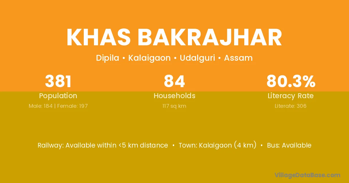 Kalaigaon (4 km) is the nearest town to Khas Bakrajhar village for major economic activities and is located approximately 4 km away.