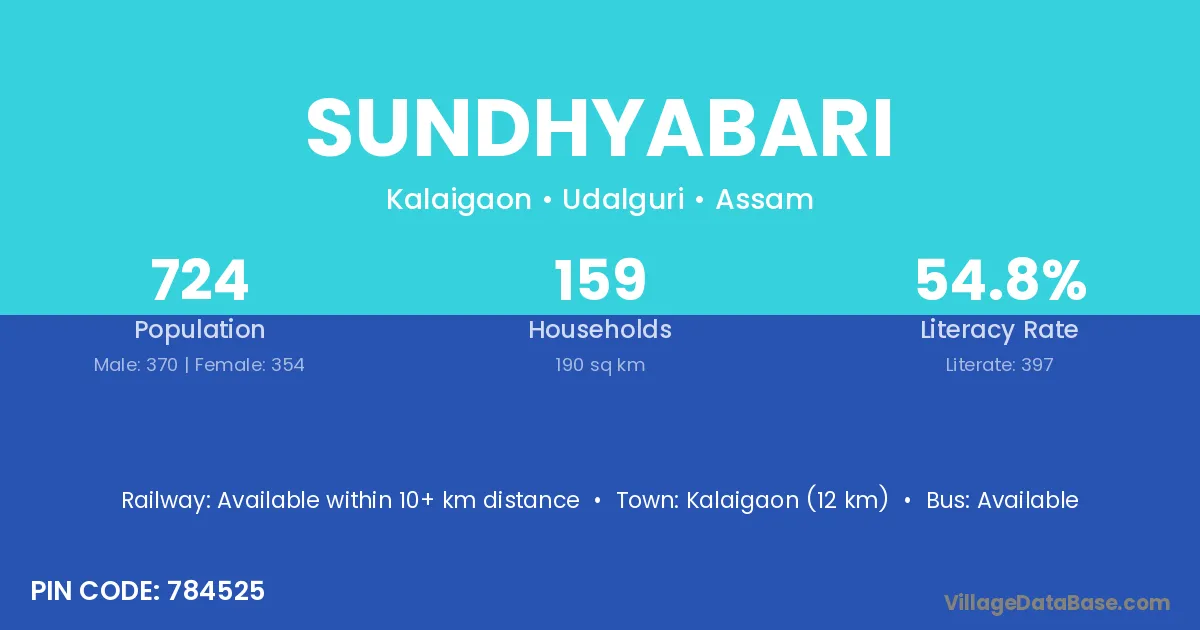 Kalaigaon (12 km) is the nearest town to Sundhyabari village for major economic activities and is located approximately 12 km away.