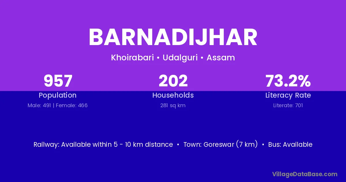 Goreswar (7 km) is the nearest town to Barnadijhar village for major economic activities and is located approximately 7 km away.