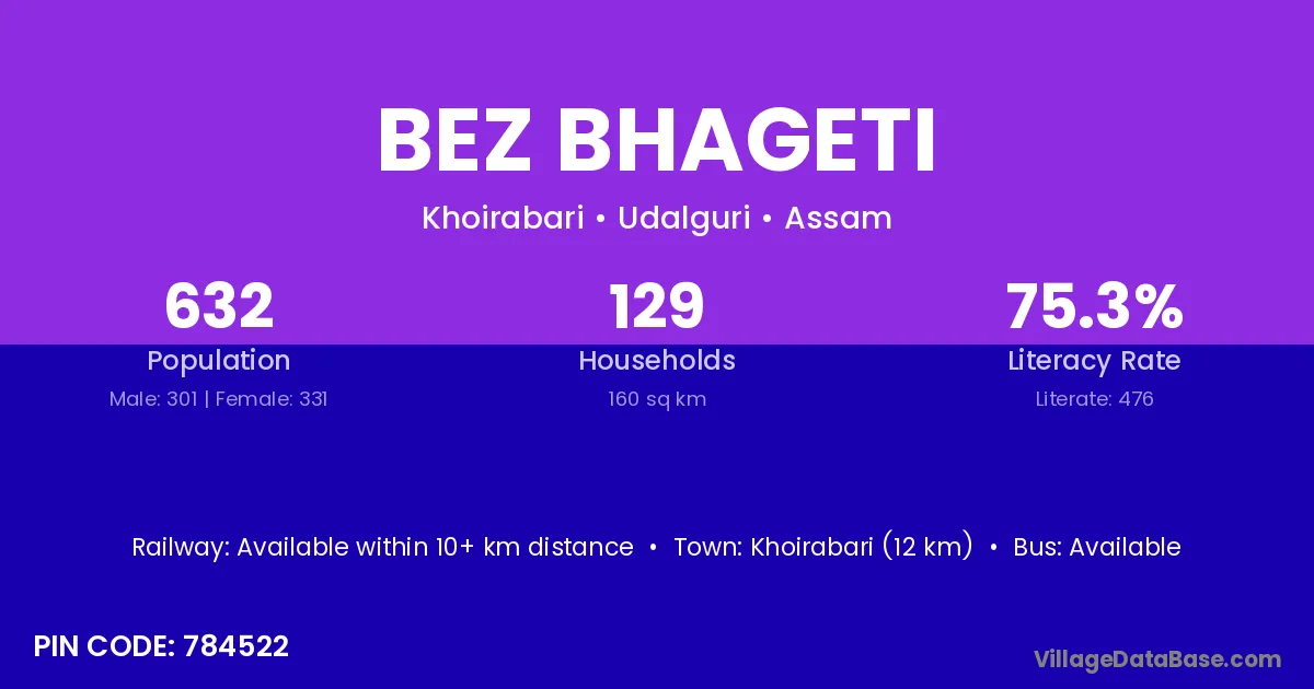 Khoirabari (12 km) is the nearest town to Bez Bhageti village for major economic activities and is located approximately 12 km away.