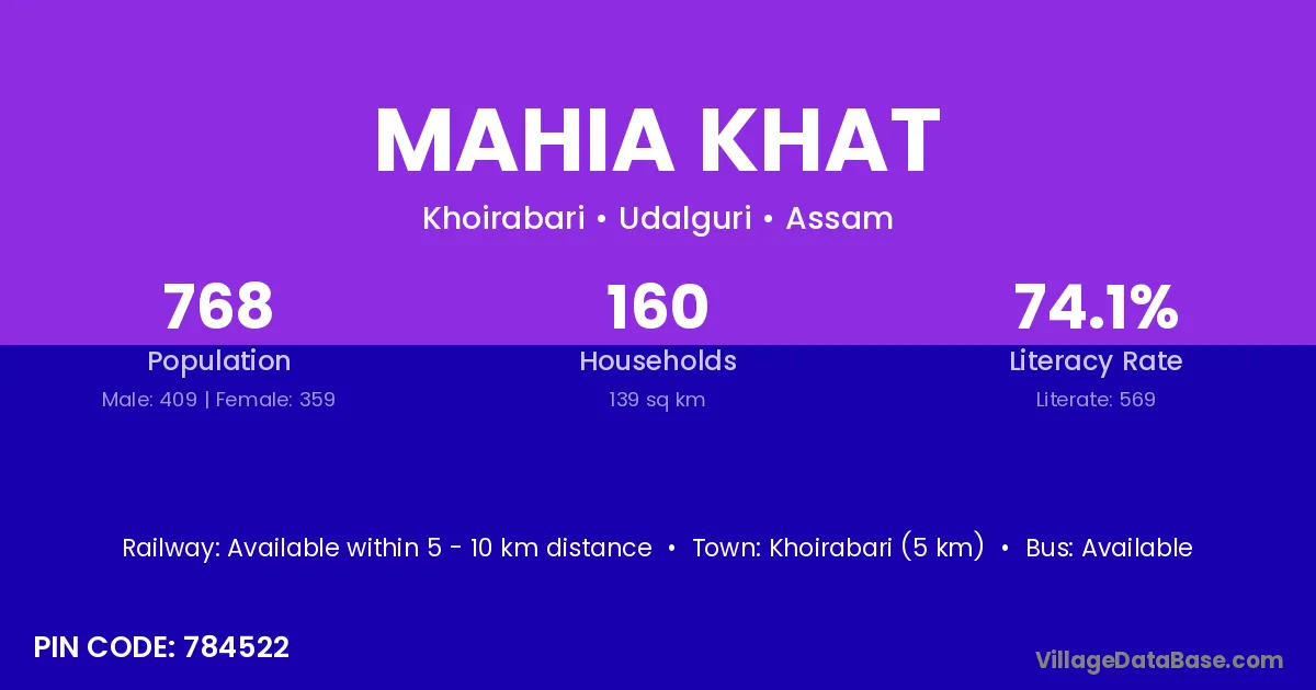 Khoirabari (5 km) is the nearest town to Mahia Khat village for major economic activities and is located approximately 5 km away.