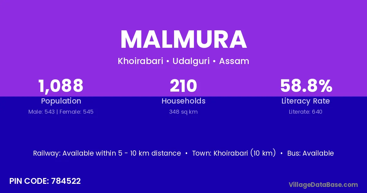 Khoirabari (10 km) is the nearest town to Malmura village for major economic activities and is located approximately 10 km away.