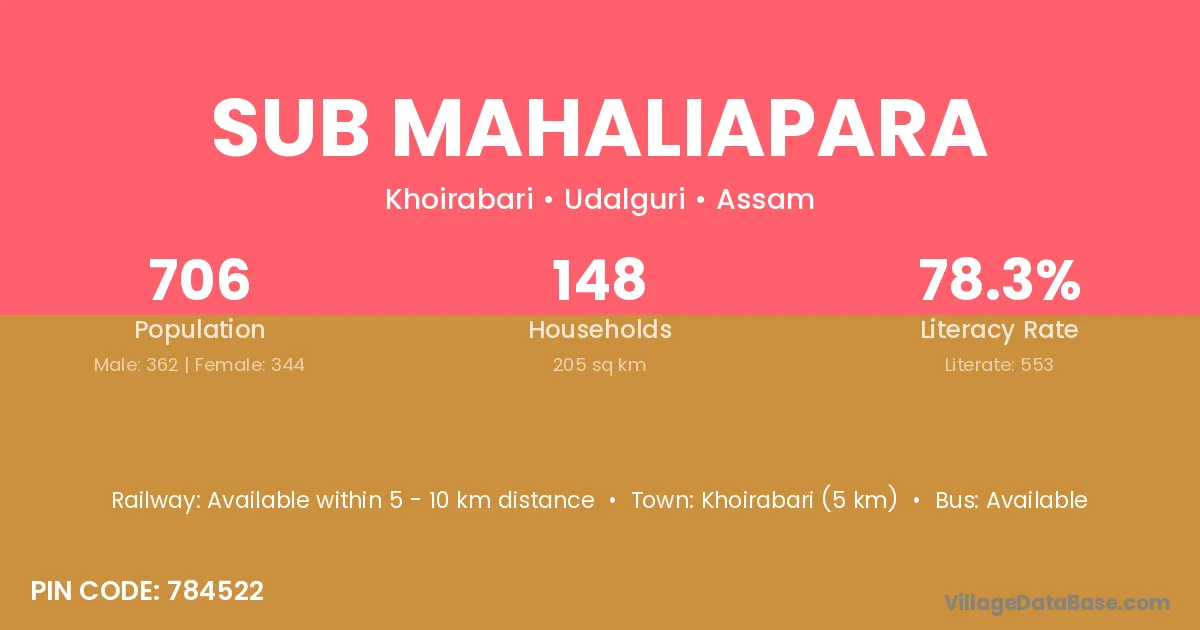 Khoirabari (5 km) is the nearest town to Sub Mahaliapara village for major economic activities and is located approximately 5 km away.